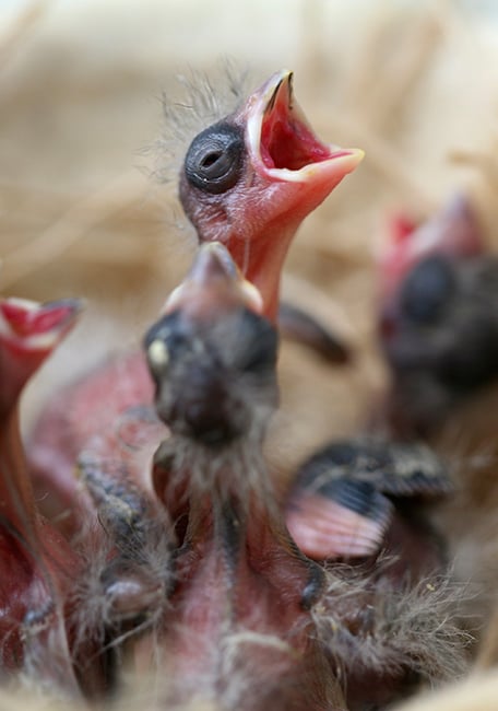 The right amount of formula to feed each chick depends on the capacity of its crop and its demand behavior. Feed small amounts of formula repeatedly in the mouth until the chicks are satiated and stop asking for food.