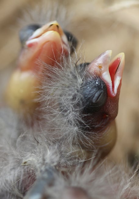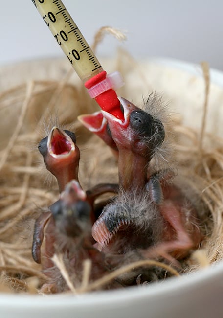 The right amount of formula to feed each chick depends on the capacity of its crop and its demand behavior. Feed small amounts of formula repeatedly in the mouth until the chicks are satiated and stop asking for food.