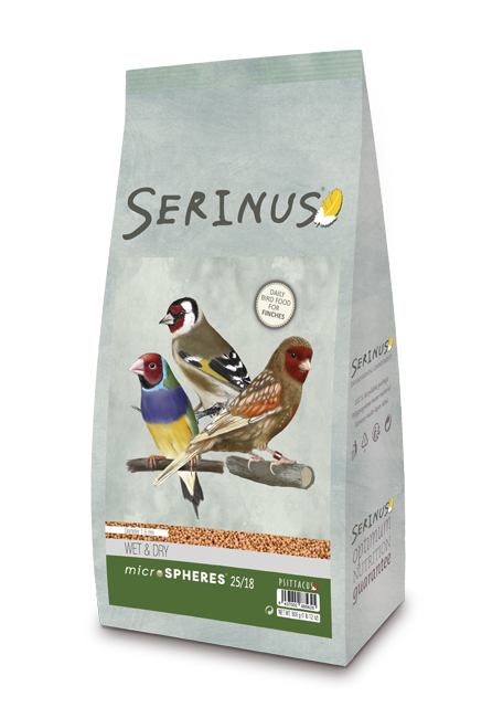 Alimento microextrusionado para pequeños paseriformes granívoros (canarios, jilgueros, verderones, diamantes de Gould, mandarines, etc.). Puede suministrarse en seco o como alimento húmedo. La versión 25/18 contiene un 25% de proteína y un 18% de grasa.